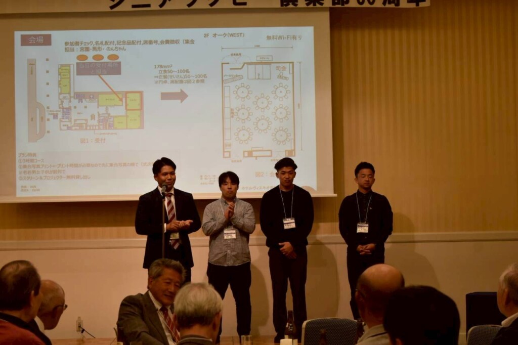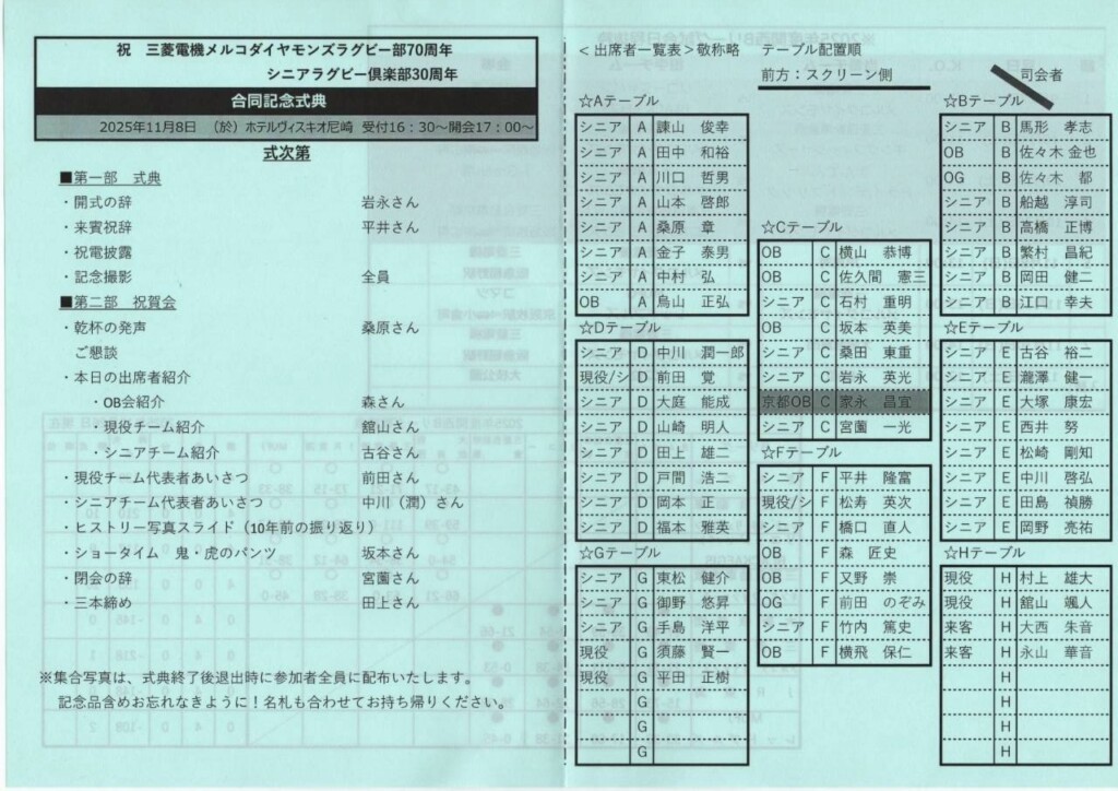 17時~20時、JR尼崎駅直結ホテル「ホテルヴィスキオ尼崎」の宴会場にて、現役チーム70年&シニアチーム30年の周年行事(合同記念式典)を行いました。